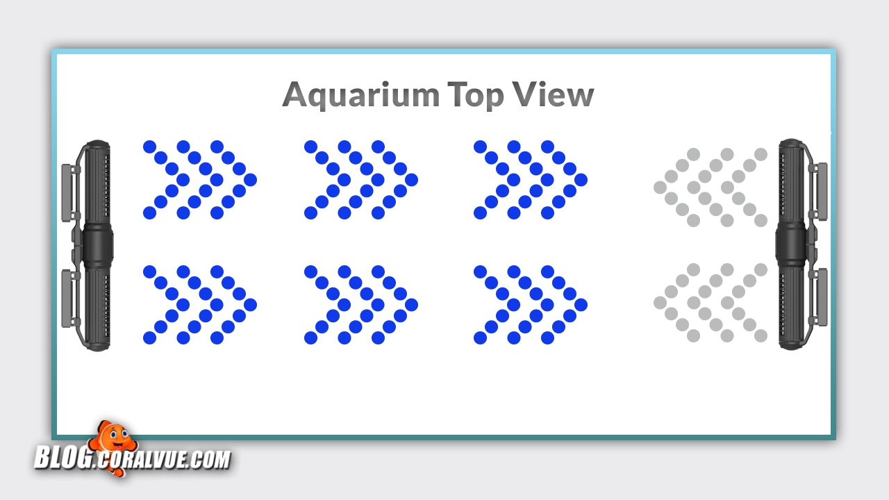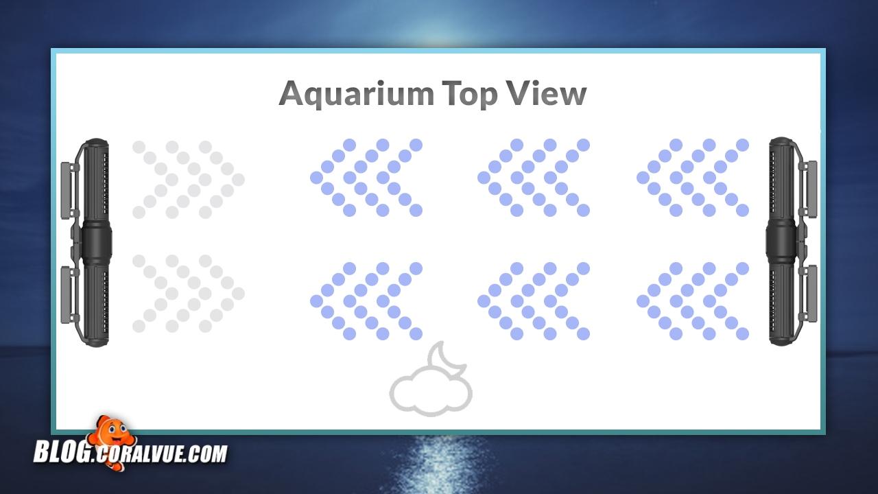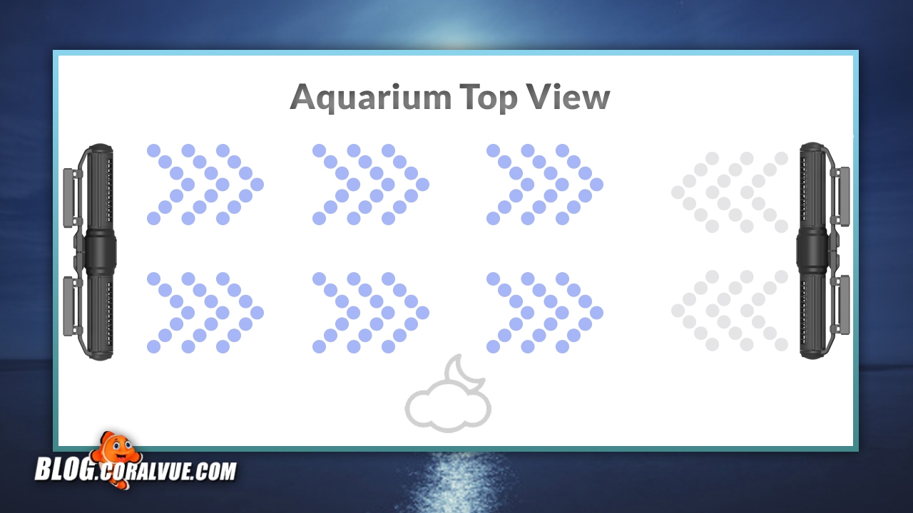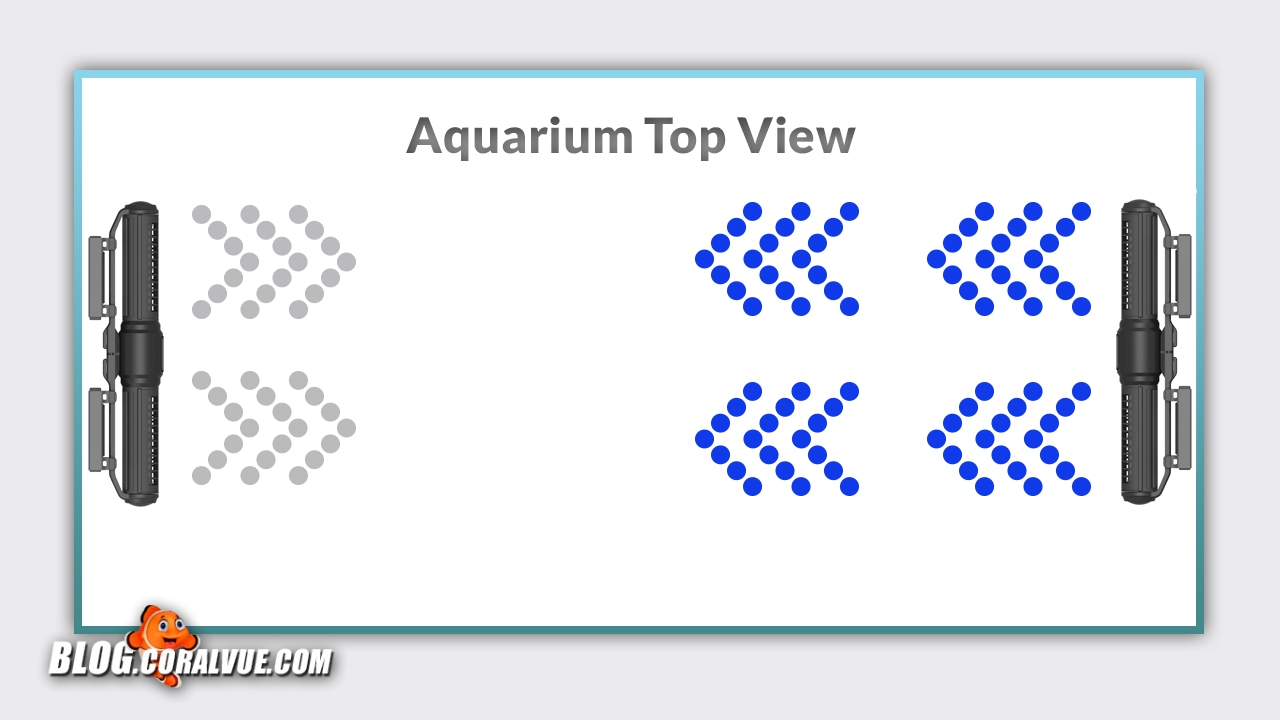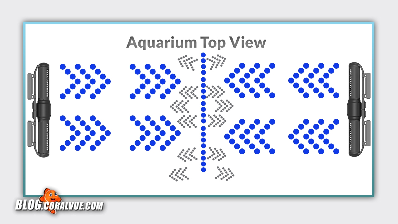 We will begin by placing two pumps horizontally on each side of our tank. Then we will alternate flow patterns so that as one pump’s intensity goes up, the opposite pump’s goes down. By synchronizing our pumps to run complimenting flows, we will be able to create the ultimate forward and reverse gyre pattern.