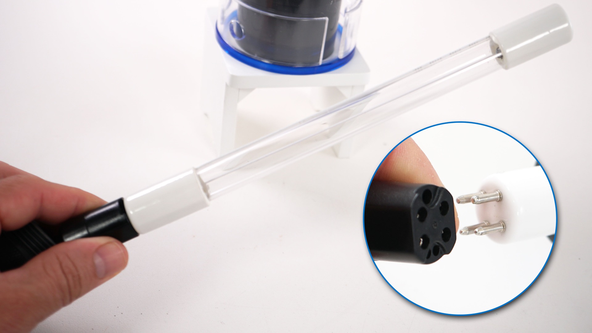 Step 3 - Connect UV Lamp to SocketWhile carefully gripping the UV lamp, insert the prongs of the lamp into the socket from the ballast cord. If the pins don't line up, spin the lamp until they do. Push the connected socket with the UV lamp into the quartz sleeve until the lamp touches the bottom.