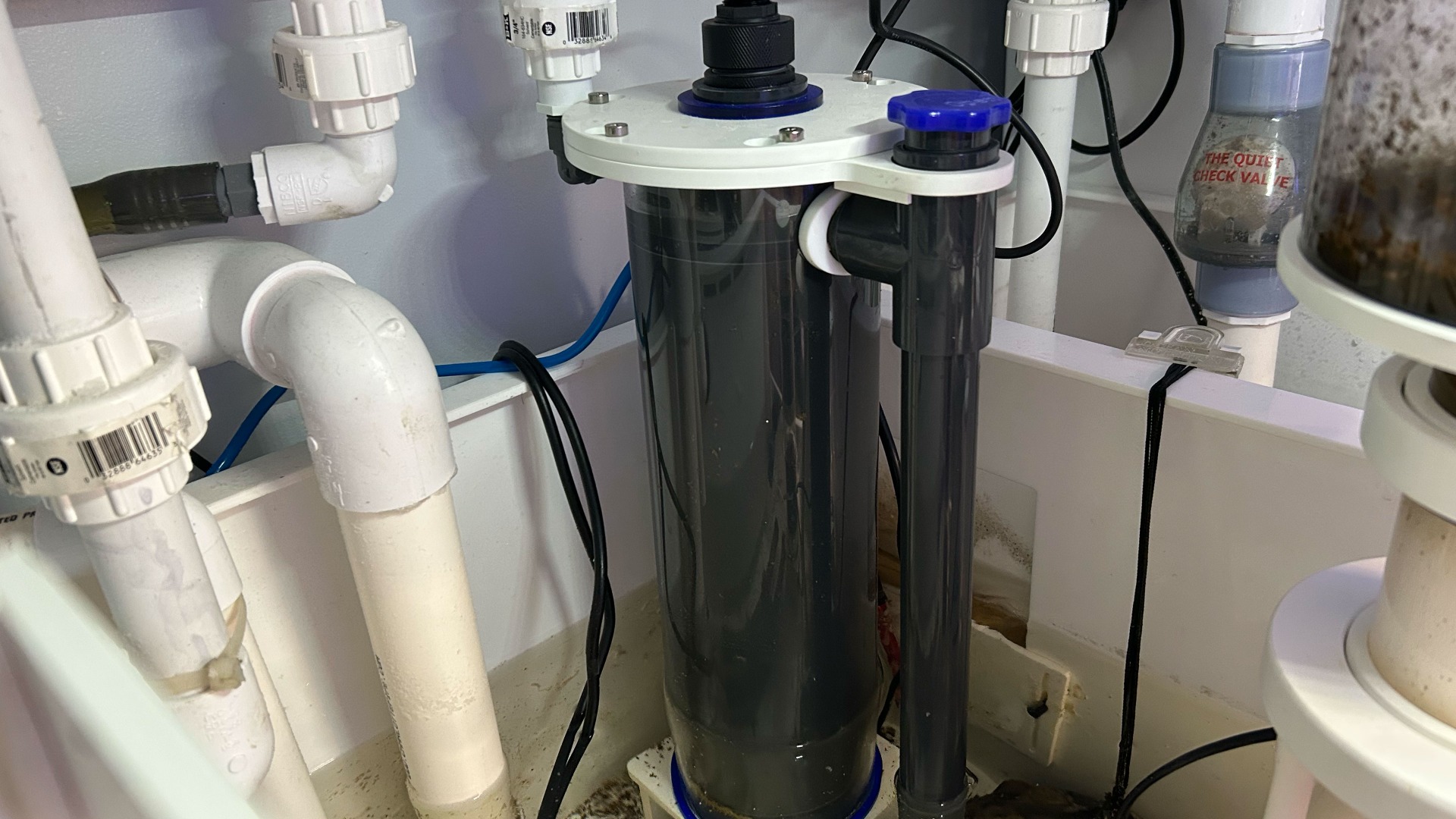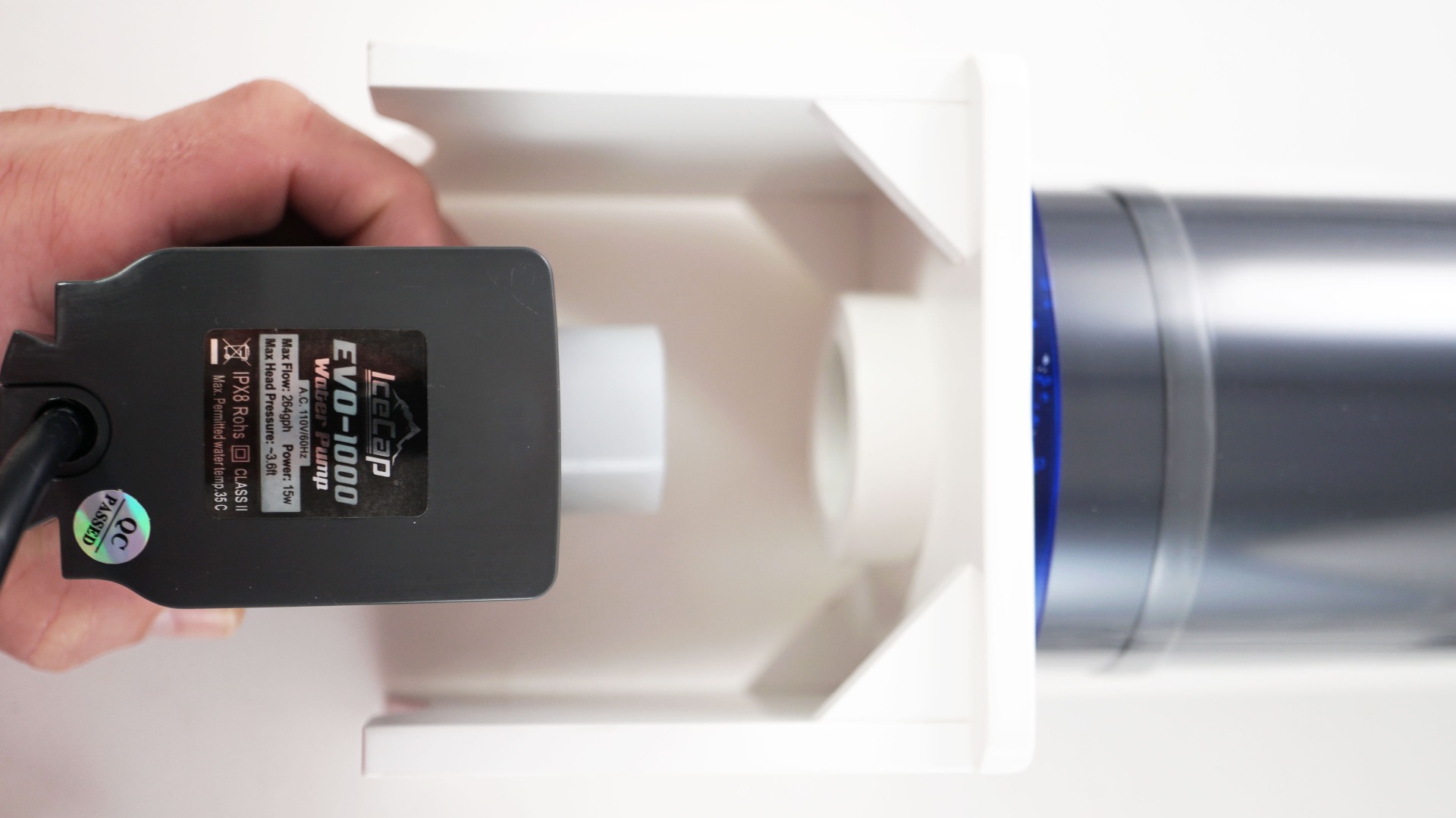 Step 8 - Place Assembled UV into the Sump Place the assembled UV into the sump. Be careful not to get any of the electrical components of the UV wet. Plug feed pump into an active power outlet. Be sure that when power to the system is off that the top portion of the UV remains above the water level.