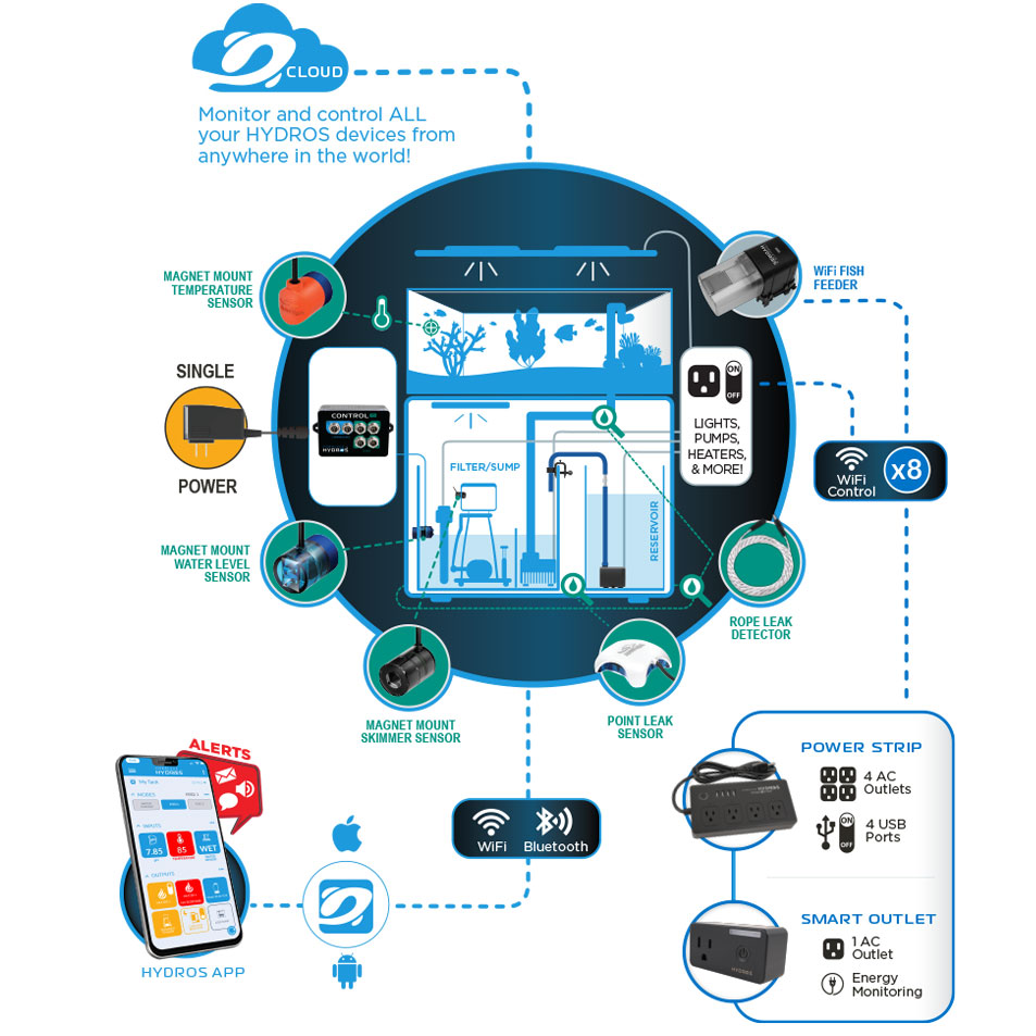 The HYDROS App allows you to create rules and set schedules to control our 4-Outlet WiFi AC Power Strips and Smart Outlets. Quickly turn on or off different pieces of aquarium equipment like pumps, powerheads, lights, heaters, algae scrubbers, UV sterilizers, protein skimmers, and more.