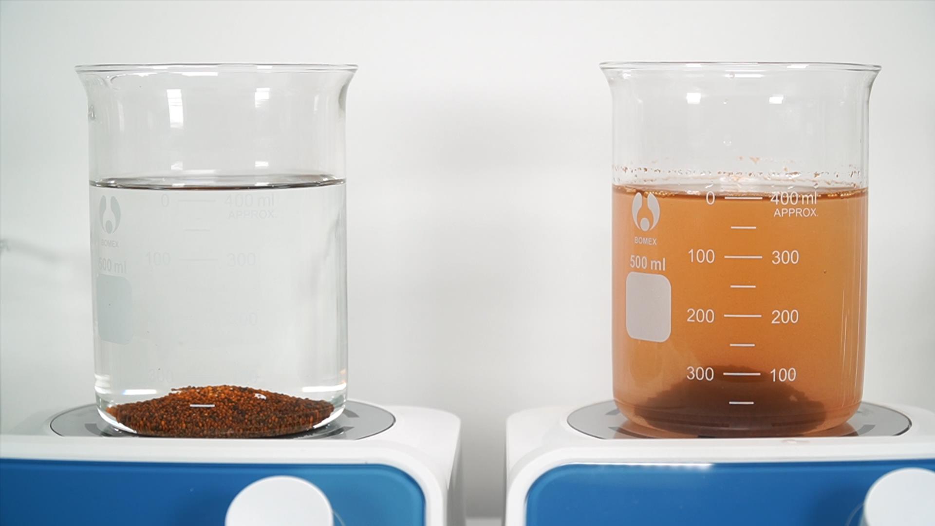 In contrast to the GFO on the right, Phosphree resin will not discolor the water or suspend in the water column.