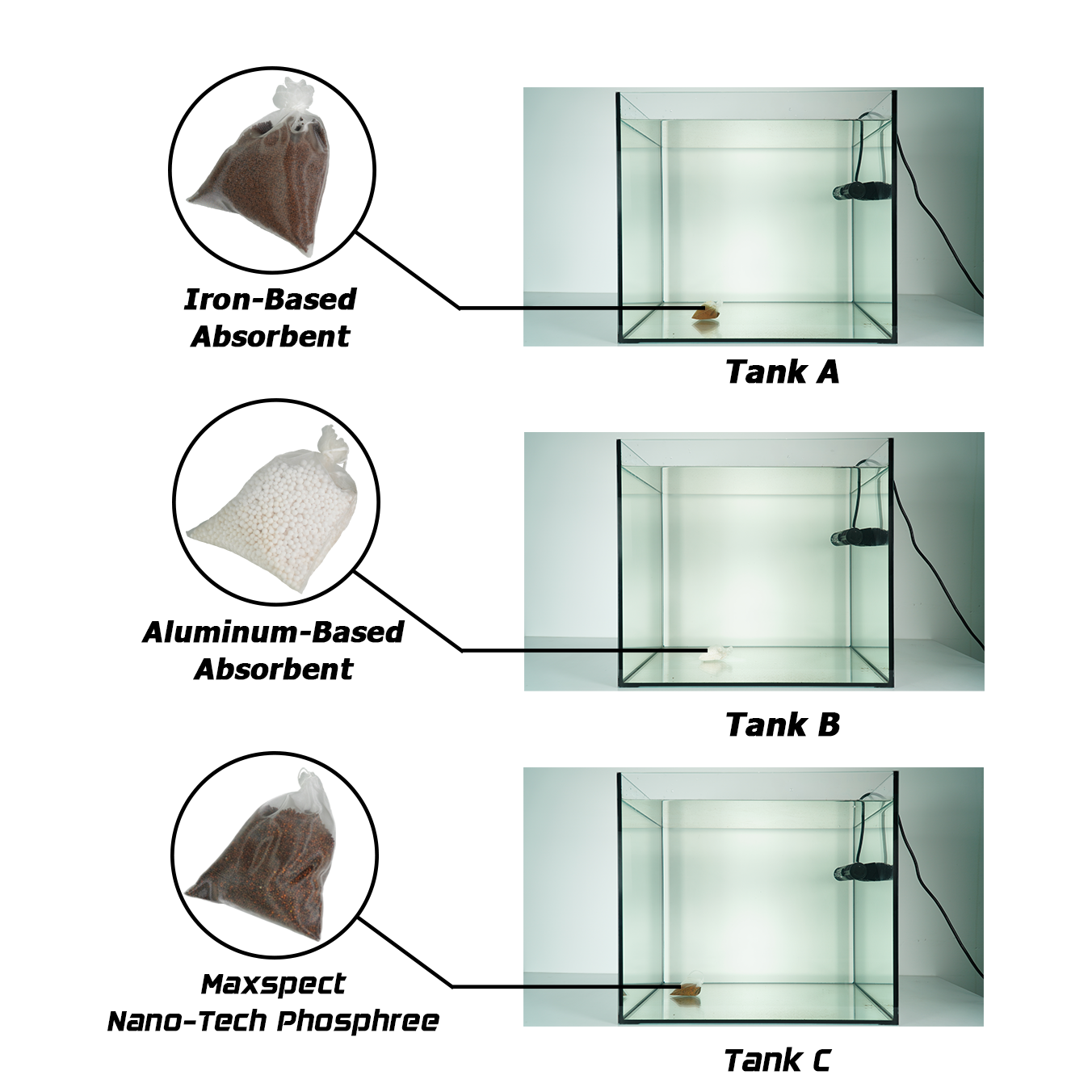 Tank A: 100L of seawater with 60ml of Iron-Based AbsorbentTank B: 100L of seawater with 60ml of Aluminum-Based AbsorbentTank C: 100L of seawater with 60ml of Nano-Tech Phosphree